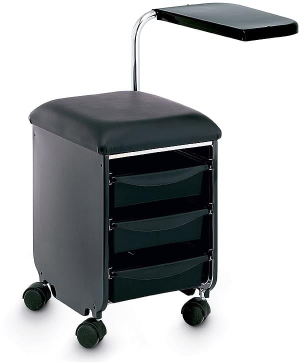 Стойка маникюрная на колесиках имеет специальную полочку, которая регулируется по высоте, основание выполнено из пластика с тремя выдвижными ящиками. Цвет: белый, черный.