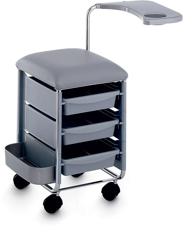 Стойка маникюрная на колесиках имеет специальную полочку, которая регулируется по высоте, основание выполнено из пластика с тремя выдвижными ящиками. Цвет: черный, белый, серебро.
