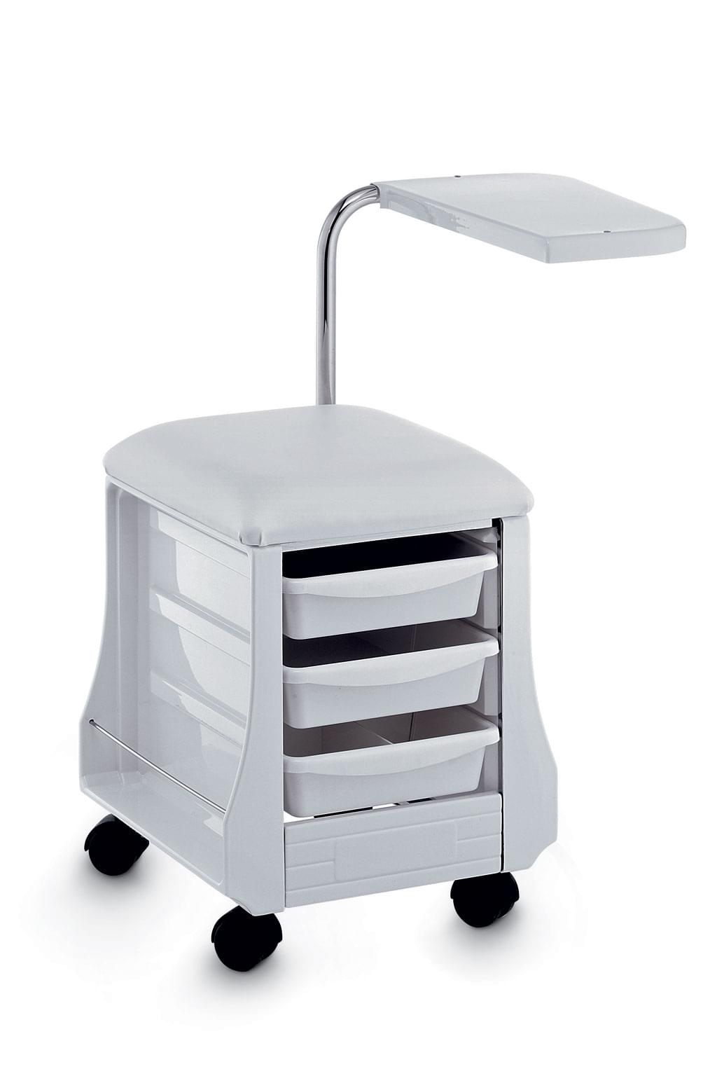 Стойка маникюрная передвижная. Стойка изготовлена из пластика, оборудована мягким сиденьем, тремя выдвижными ящиками, вращающейся подставкой для рук, боковыми полочками с металлическими держателями. Варианты цвета: белый, черный. Размер: 38х38х50