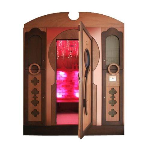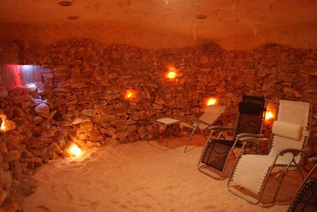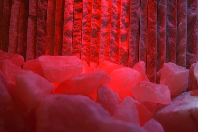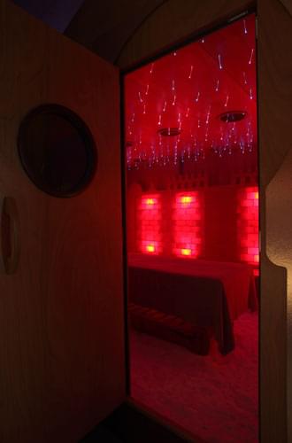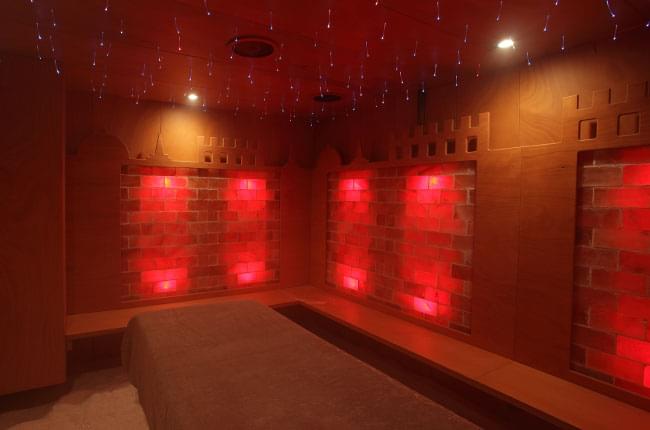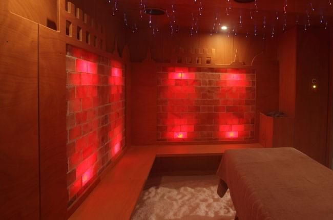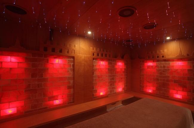 Созданная в едином удивительном архитектурно-декоративном стиле - стены выложены кирпичиками розовой гималайской соли, на полу рассыпана гималайская соль, которая благодаря своим антибактериальным и противовоспалительным свойствам способна очищать дыхательные пути, помогает при ушных болезнях, аллергиях и кожных заболеваниях (дерматитах, псориазах и т.д.), укрепляет иммунную систему и снимает мышечное напряжение и стресс. Также комната оснащена накаливающейся печью, хромотерапией, музыкотерапией, распылителем соли и ароматов. Благодаря сенсорной панели управления можно осуществлять при стабильной температуре и уровне влажности курсы био-сауны или галотерапические процедуры, которые особо рекомендованы людям, подверженным сезонным недомоганиям или ведущим мало здоровый образ жизни, особенно актуально для жителей мегаполисов.