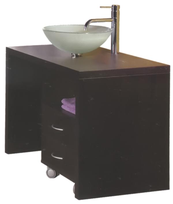 Лаборатория выполнена из дерева цвета венге. Имеет выкатную тумбу с ящиками и стеклянную раковину со смесителем.