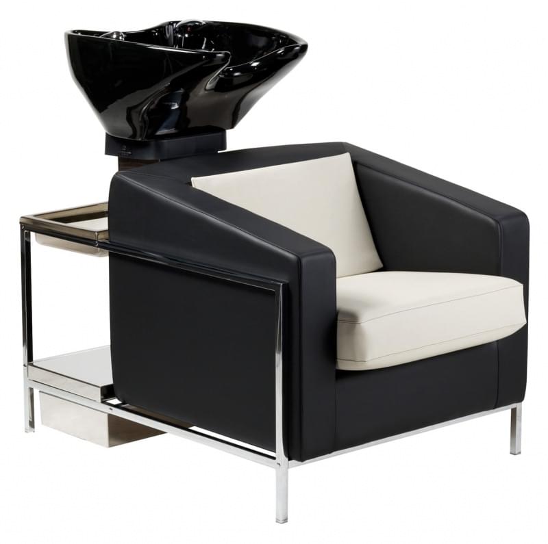 Мойка с креслом на алюминиевом каркасе по бокам имеются полочки. Комплектуется глубокой керамической раковиной белого или черного цвета, с регулировкой угла наклона, комплектом смесителя с хромированной лейкой душа. Кресло квадратной формы, мягкие элементы обтянуты искусственной кожей высшего качества, мягкие подлокотники.