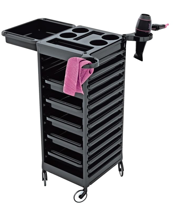 Тележка парикмахерская закрытого типа на колесиках. Выполнена из прочного пластика, имеет 6 выдвижных ящиков, фенодержатель и боковые полочки из металла.