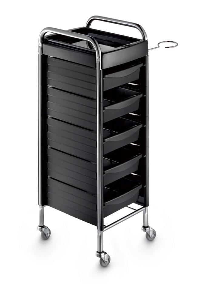 Тележка парикмахерская выполнена из пластика, на колесиках, с выдвижными ящиками. Цвет: черный, серый