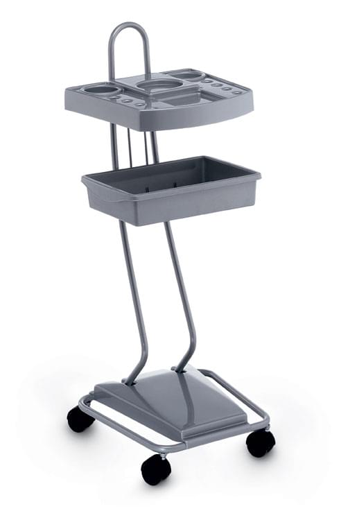 Тележка для краски, передвижная на колесах. С отверстиями для брашеров, углублениями для чаш, с одним яшиком. Материал - пластик. Цвет - серебро.