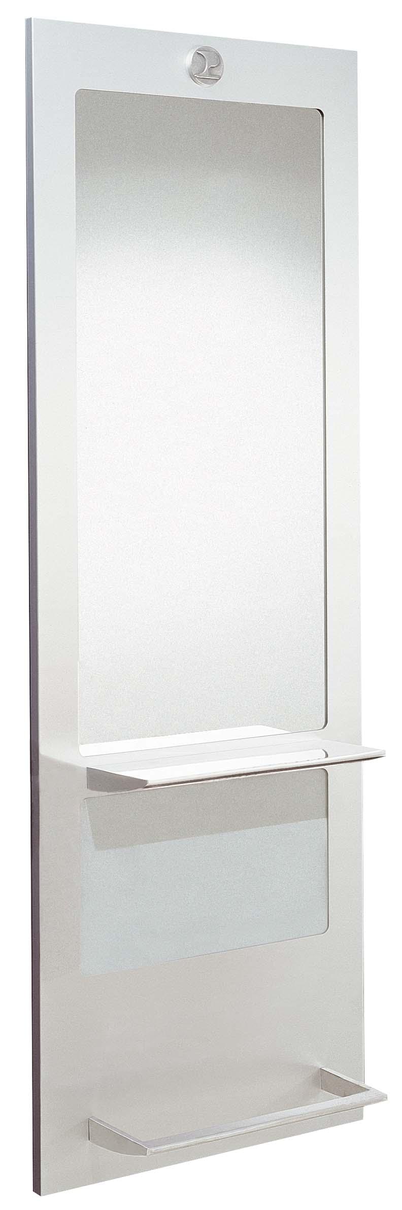 Зеркало парикмахерское в раме из алюминия, плоская хромированная столешница с фенодержателем, подставка под ноги. Возможен вариант с подсветкой. Крепление к стене.