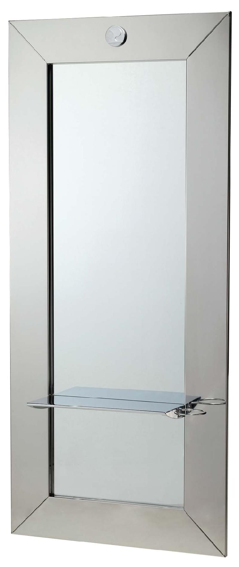 Зеркало парикмахерское прямоугольной формы в раме из нержавеющей стали, плоская хромированная столешница с фенодержателем. Возможен вариант рамы в ламинате цвета венге. Крепление к стене.