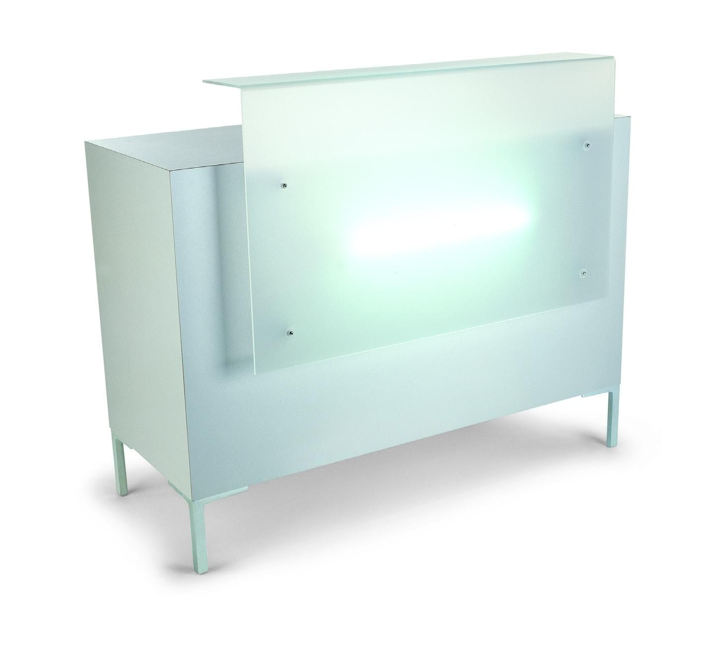 Стойка администратора. Фасад из белого или голубого оргстекла с подсветкой, тумба из дерева или ламината.
